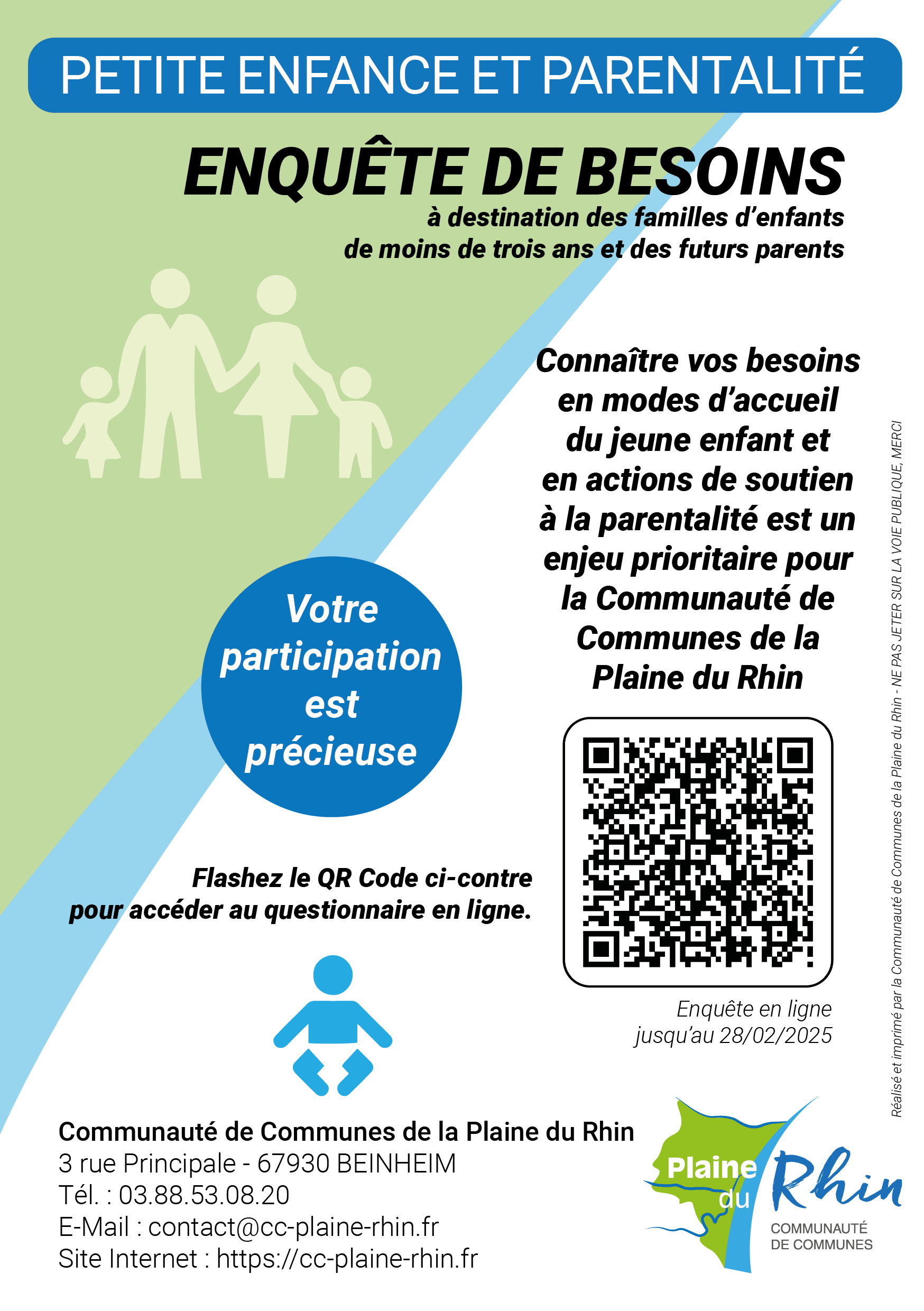 Dans le cadre du Service Public de la Petite Enfance (SPPE), la Communauté de Communes de la Plaine du Rhin vous sollicite pour répondre à une enquête en ligne sur les besoins des familles ayant des enfants de moins de 3 ans ou des futurs parents.